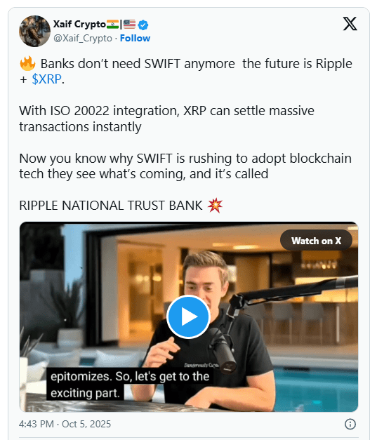 Trong khi bài viết của Xaif đề cập ngắn gọn đến việc chấm dứt sự phụ thuộc vào ngân hàng vào SWIFT và ảnh hưởng ngày càng lớn của công nghệ Ripple thông qua tích hợp ISO 20022, thì trọng tâm thực sự nằm ở video kèm theo.