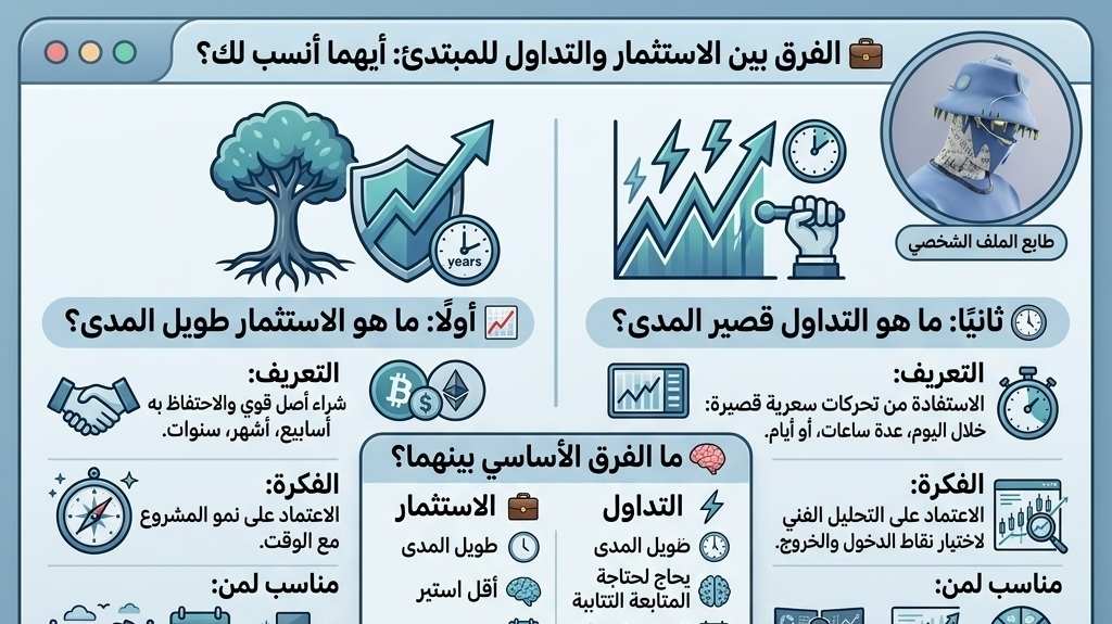عندما يدخل أي شخص جديد إلى عالم العملات الرقمية، غالبًا يحتار بين الاستثمار طويل المدى والتداول قصير المدى.