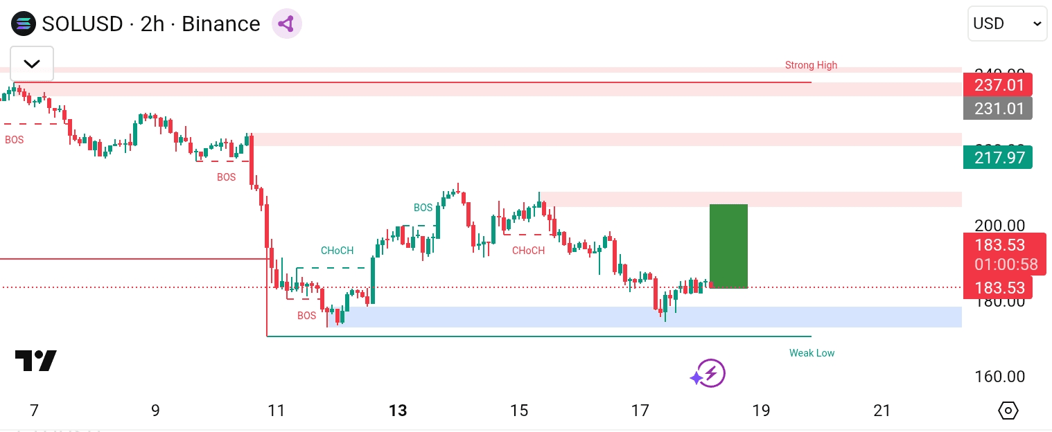 Sổ tay (ngắn & chính xác) — Mua: vào lệnh khi đóng cửa 2H sạch trở lại trên $186–188 (chiếm lại vùng), SL dưới mức thấp của bóng (~$174), TP1 $195 (lật/kháng cự), TP2 $205–217 (OB lớn) — ~10–20% tiềm năng tăng giá. Bán: nếu giá không thành công và đóng cửa dưới $174 trên 2H, mục tiêu $160 sau đó $148 — SL chặt trên $180 để tránh bị giả.