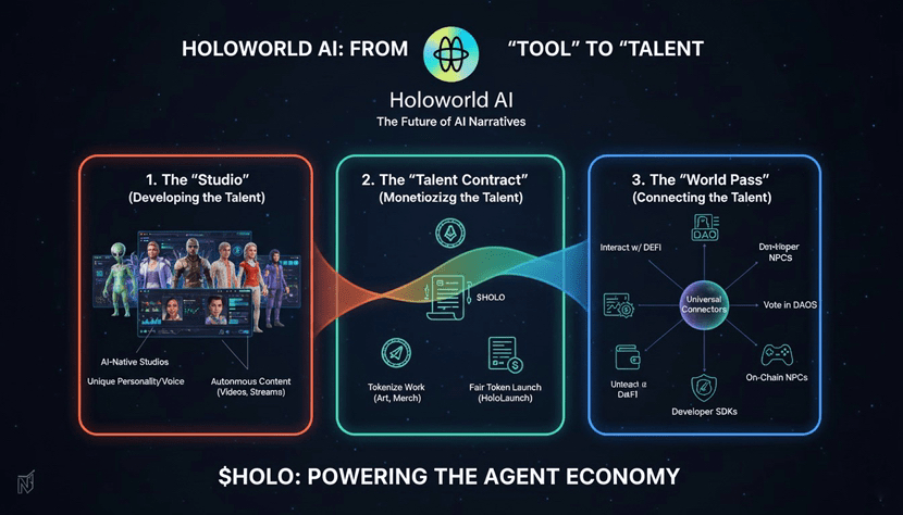 Một khi một AI đã được "phát triển," nó cần một công việc. Holoworld cung cấp hạ tầng kiếm tiền Web3. Đây là "hợp đồng tài năng" của AI. Nó cho phép các nhà sáng tạo và chính các AI: