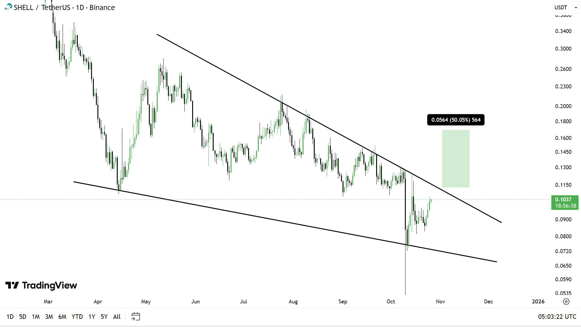 $SHELL Có vẻ như Tăng giá 🦬 khi nó hình thành mô hình Wedge giảm trong khung thời gian hàng ngày.