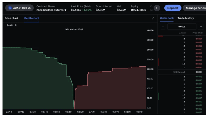 Biểu đồ độ sâu cho thấy sự cân bằng giữa người mua và người bán quanh mức $0.69, nơi ADA đã giao dịch trong một khoảng hẹp. Giá $0.685 (+1.5%) cho thấy động lực tăng nhẹ được hỗ trợ bởi hoạt động mua trong các khu vực giá thầu thấp hơn. Các đơn đặt hàng lớn tập trung giữa $0.63 và $0.67, trong khi phía bán dày đặc giữa $0.72 và $0.78, đánh dấu khả năng kháng cự nơi việc chốt lời có thể gia tăng.