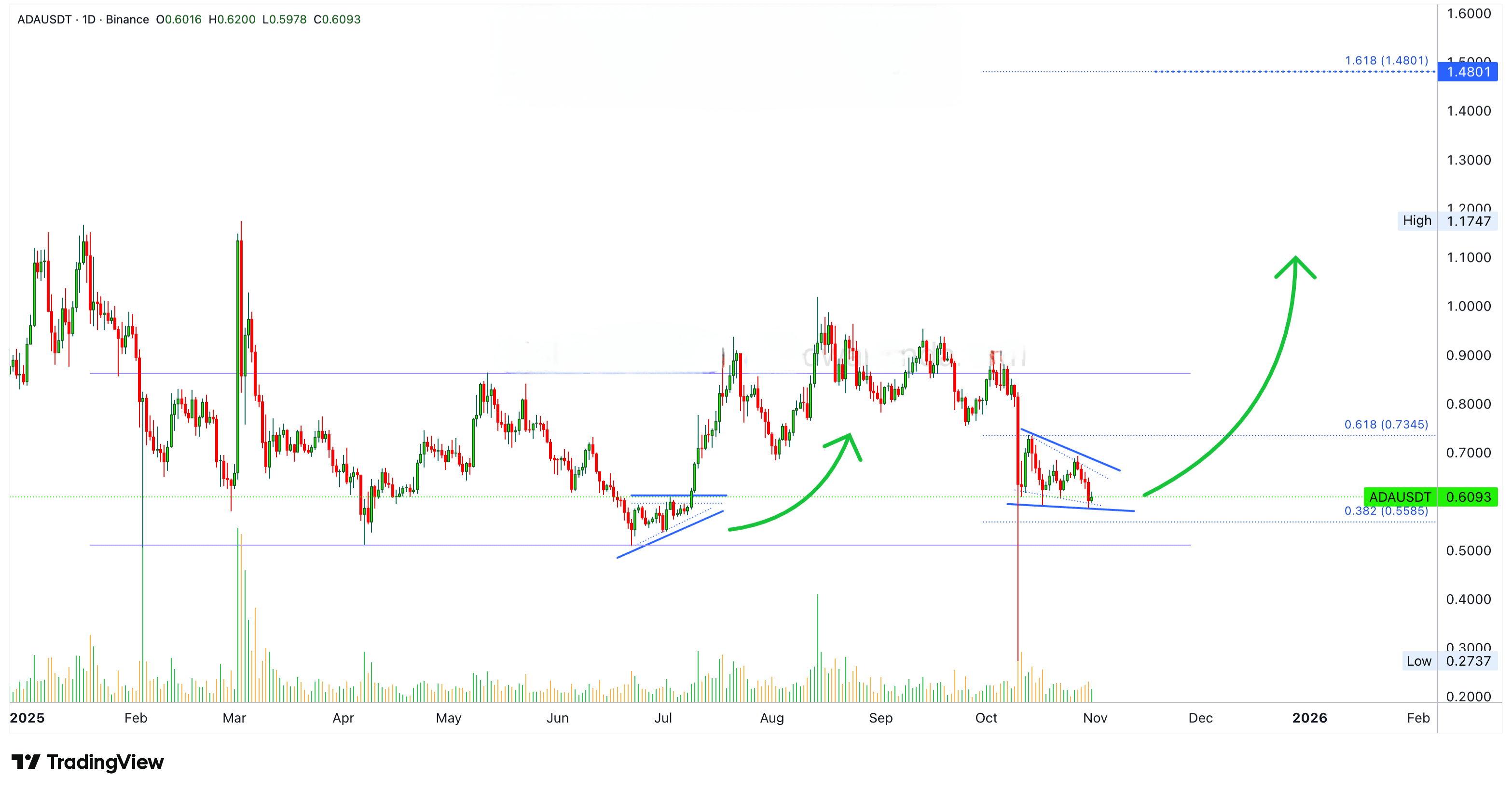 Khi thị trường giảm, giao dịch gần mức hỗ trợ, bạn mua mạnh qua điểm. Sử dụng $10,000 để mua tất cả Cardano. Thay vì USDT, bây giờ bạn có đồng ADA.
