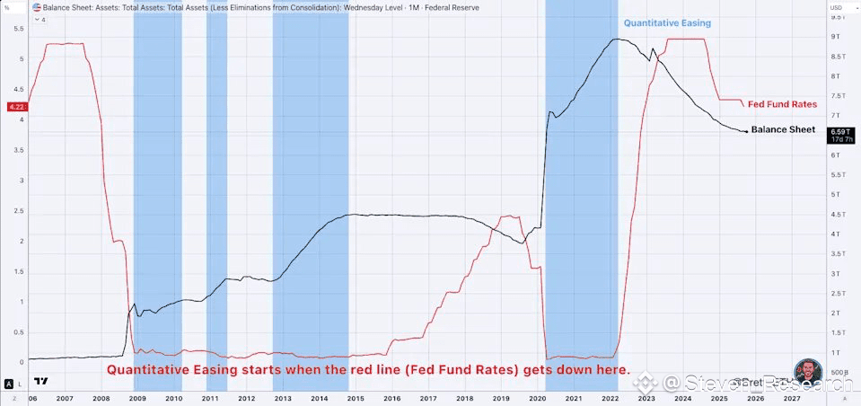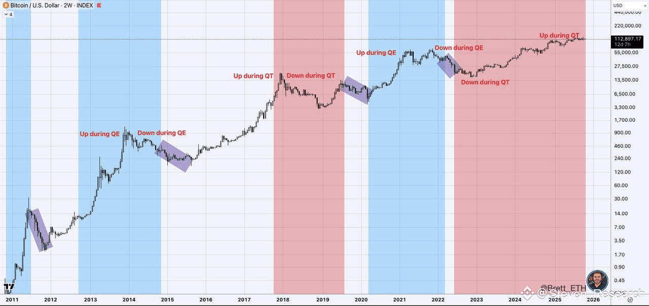 - Lịch sử cho thấy BTC không tăng ngay khi QT dừng; thường chỉ mạnh sau khi QE thực sự bắt đầu và lợi suất dài hạn giảm mạnh. Giai đoạn “pause” giữa QT và QE thường là thời điểm dễ nhiễu và có thể giảm mạnh (trên biểu đồ)