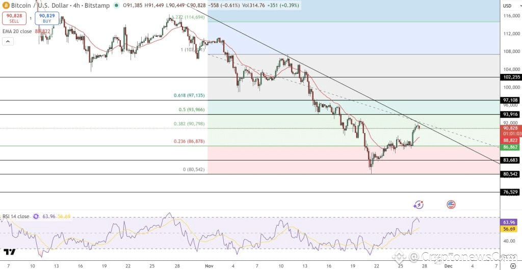 Bitcoin is attempting to stabilize after weeks of selling, with the 4-hour chart showing signs of a potential shift in momentum. Price is now testing a descending trendline aligned with the 0.382 Fibonacci level near $90,800, a key zone that has capped every rebound since early November. The bounce from $83,683 has created a higher low, while BTC has reclaimed the 20-EMA and is closing in on the 50-EMA, hinting at improving short-term strength.