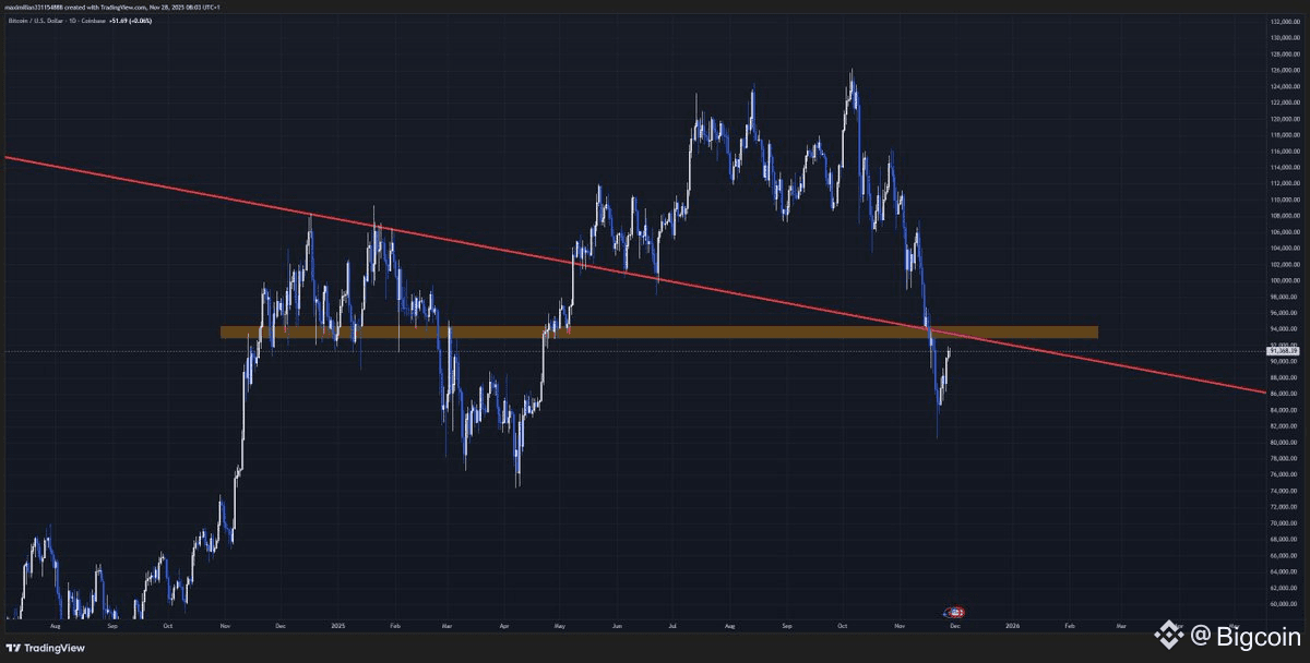 $BTC đã nằm yên quanh 91–92k hơn một ngày, và giữ trên 80k hơn một tuần. Nhưng hành vi giá cho thấy rõ ràng: đây là vùng tái phân phối. Không có lực đẩy chủ động, không có volume đột biến, và đặc biệt, cú hồi gần nhất chỉ vừa chạm lại trendline giảm dài hạn.