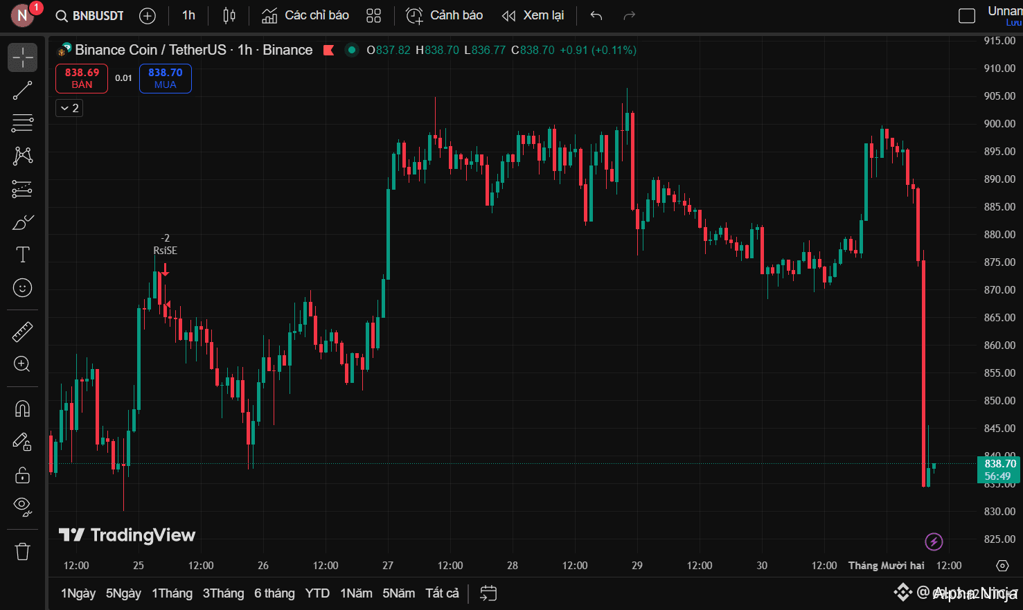 Nhìn BNB rơi thẳng từ vùng 890 xuống dưới 840 sẽ khiến nhiều người nghĩ thị trường gãy, nhưng thực tế lực bán không kéo dài như một cú breakdown thật. Khối lượng bán chỉ bùng lên đúng một nhịp rồi tắt, trong khi volume hấp thụ xuất hiện ngay sau đó. Dạng biến động này cực kỳ quen trong các pha wash trading trước pump.