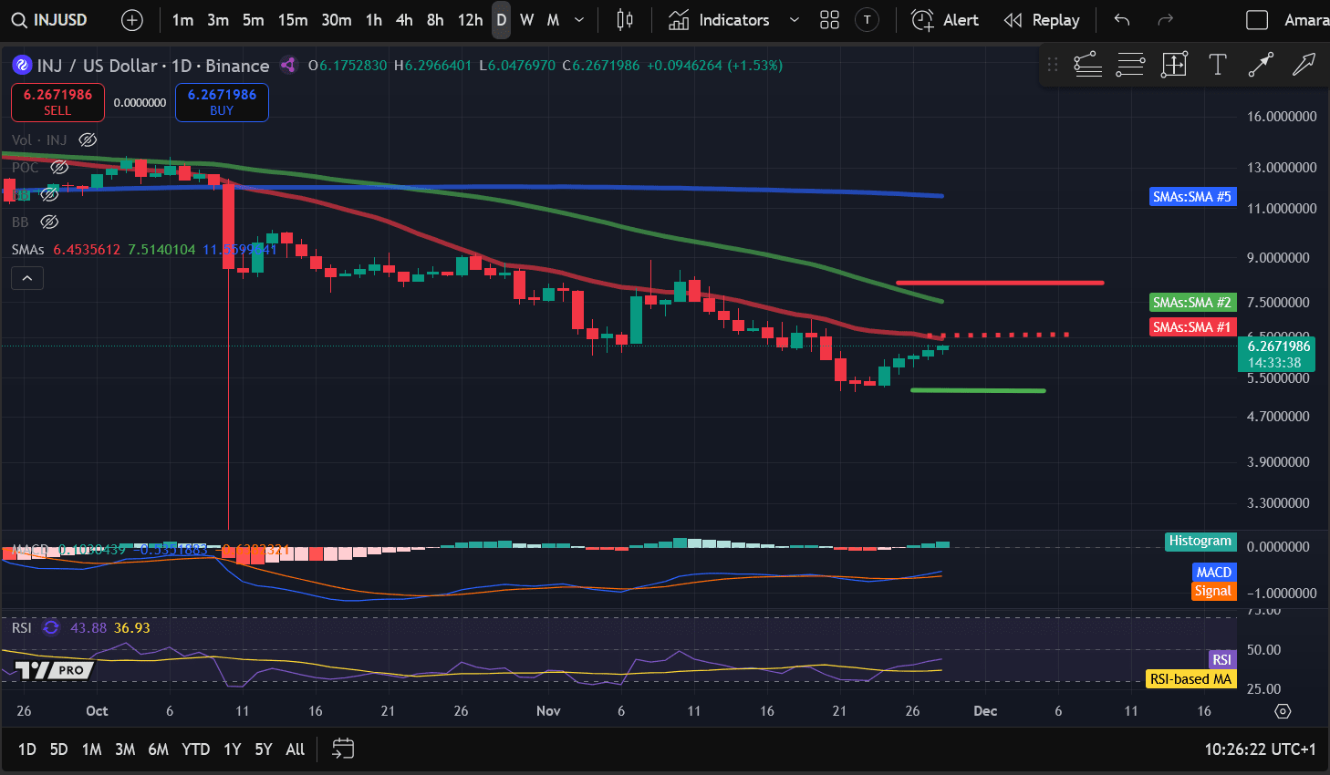Injective (INJ) đã ghi nhận một sự sụt giảm mạnh vào thứ Hai (17 tháng 1), giảm 3.94% xuống còn $6.242. Giá đã phục hồi vào thứ Ba, tăng gần 6% lên $6.603. Nó đã mất động lực vào thứ Tư, giảm 1.34% xuống $6.515. Áp lực bán vẫn tiếp tục vào thứ Năm khi INJ giảm gần 9% xuống $5.931. Tâm lý giảm giá gia tăng vào thứ Sáu khi giá giảm hơn 8% xuống $5.439.