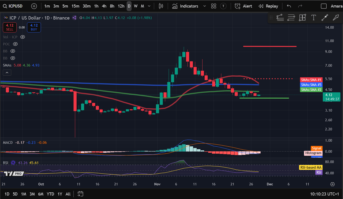Diễn biến giá có sự pha trộn vào cuối tuần khi ICP giảm hơn 6% vào thứ Bảy trước khi ghi nhận một sự tăng nhẹ vào Chủ nhật và ổn định ở mức $4.05. Người mua giữ quyền kiểm soát vào thứ Hai khi giá tăng gần 4% lên $4.20. ICP tiếp tục tăng vào thứ Ba, tăng gần 4% và ổn định ở mức $4.36. Tuy nhiên, nó đã mất đà sau khi đạt đến mức này và giảm 2.52% xuống $4.25. Áp lực bán tiếp tục diễn ra vào thứ Năm khi giá giảm 4.94% xuống $4.04. ICP đã tăng gần 2% trong phiên giao dịch hiện tại, giao dịch quanh mức $4.12.