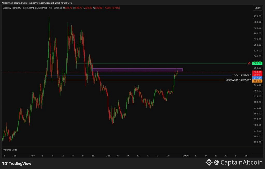 Right now, ZEC is in a pretty classic continuation setup. It broke out, held its gains, and is now pushing into a key resistance area. Price action in the $532 to $549 range will likely set what happens next.
