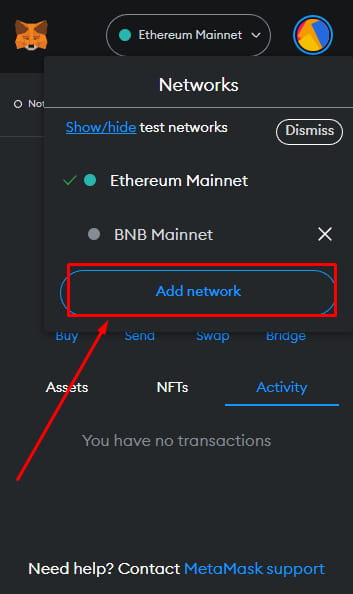 Mở ví và nhấp vào trường có tên mạng và từ danh sách thả xuống, chọn Thêm mạng: