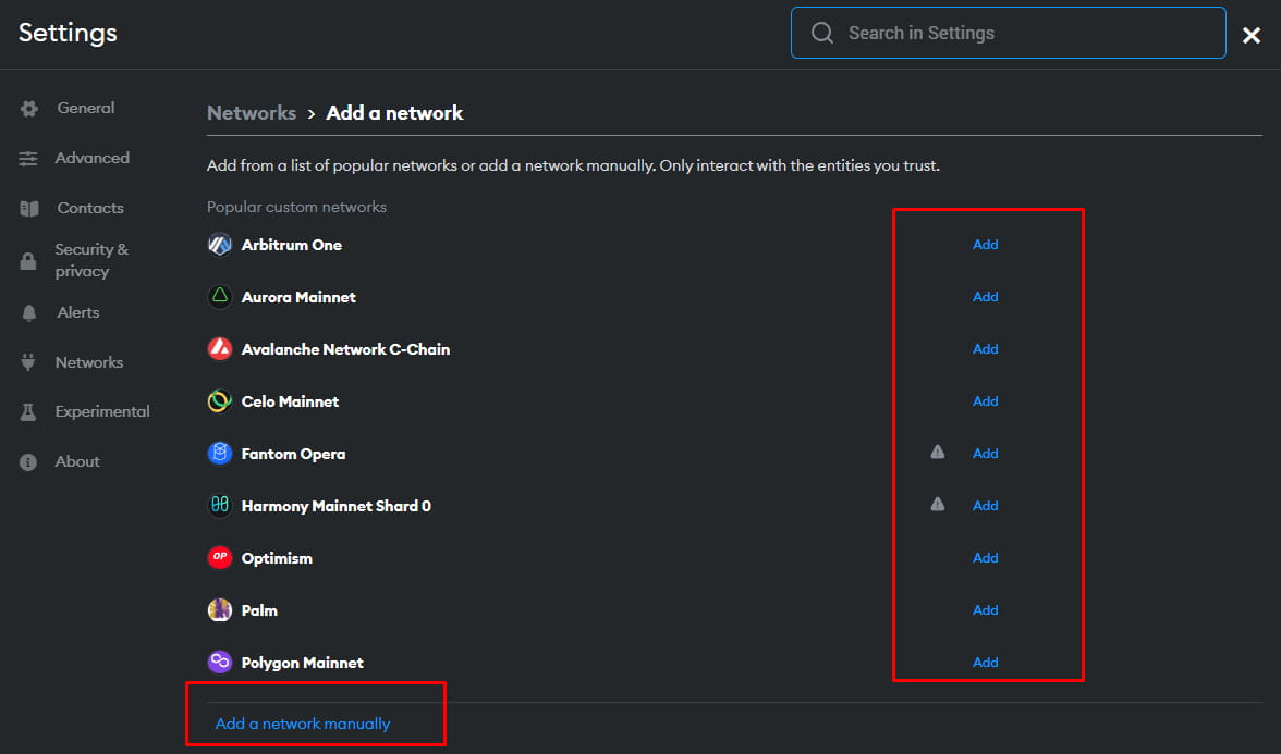 Cửa sổ cài đặt mạng MetaMask sẽ mở ra, tại đây bạn có thể nhấp vào Thêm vào mạng mà bạn quan tâm. Khi nhấp vào, một cửa sổ xác nhận sẽ xuất hiện trong đó bạn cần chọn Phê duyệt. Nếu các mạng phổ biến không có BSC thì nhấn vào Add network manual: