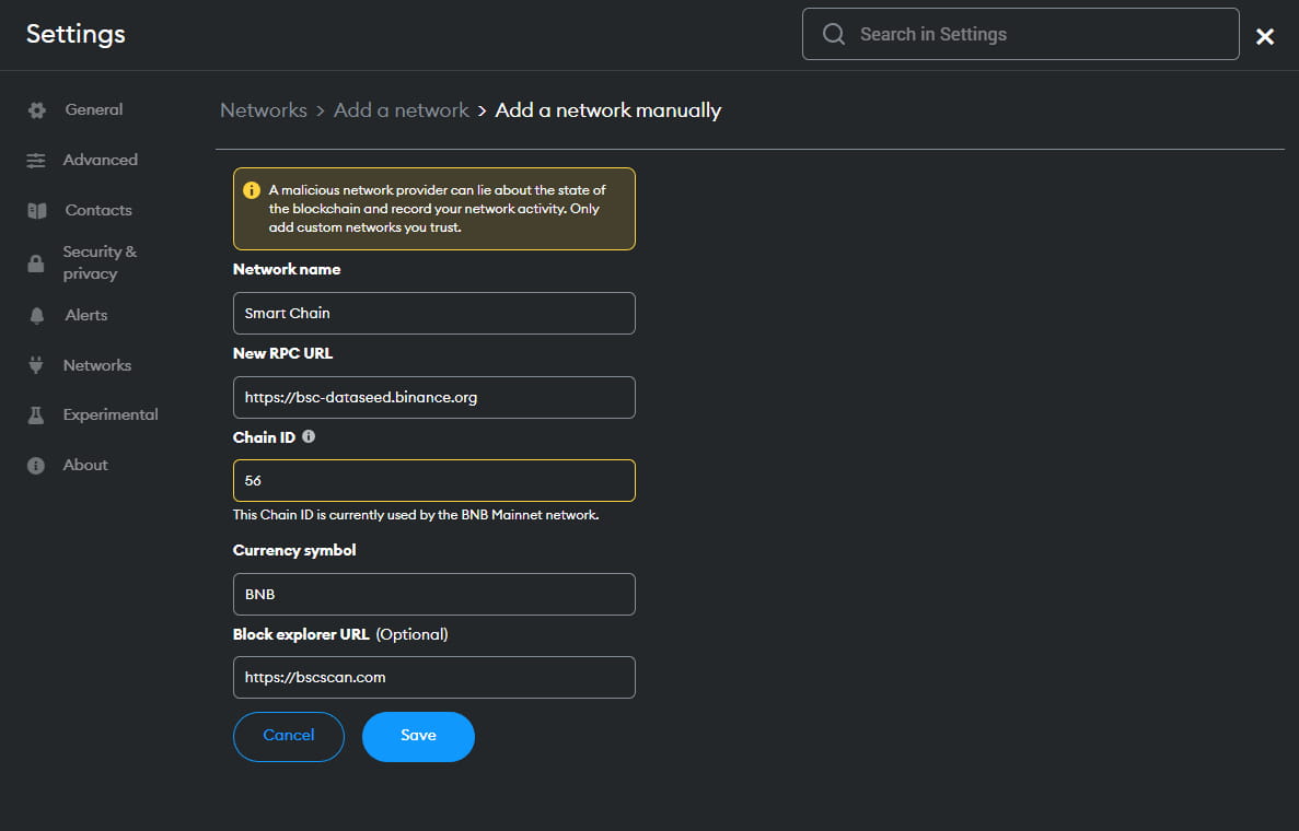Điều đáng chú ý là Metamask có khả năng hỗ trợ các mạng khác và chuyển đổi giữa chúng. Vì vậy, ví dụ: bạn có thể thiết lập Binance Smart Chain (BSC), Huobi Eco Chain (HECO), mạng Avalanche và nhiều mạng khác, trong Metamask của mình và sử dụng các ứng dụng đã có trong các blockchain khác. Điều này giúp bạn dễ dàng làm việc với nhiều dự án, con dấu, chuyển tiền điện tử và các dự án khác.