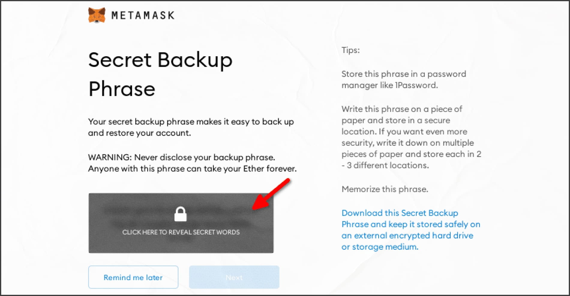 Trong bước tiếp theo, bạn có thể thấy cụm từ hạt giống mà bạn chắc chắn nên viết ra, đó là cách duy nhất để khôi phục tài khoản của bạn nếu có điều gì đó xảy ra. Ngoài ra, chúng tôi khuyên bạn nên lập biên bản trên một tờ giấy và giấu nó an toàn (điều chính là không quên nơi). Nếu không có cụm từ này, bạn sẽ không thể khôi phục quyền truy cập vào ví của mình trong trường hợp cần thiết. Sau khi bạn đã viết xong mọi thứ, hãy nhấp vào Tiếp theo: