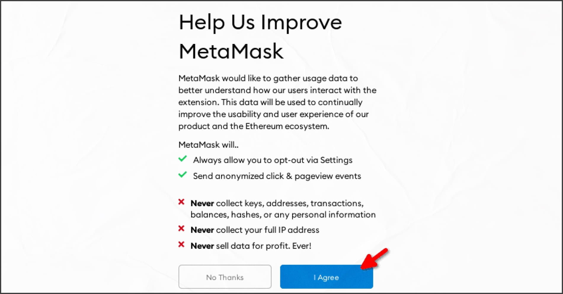Cài đặt Metamask. Bước 3. Tiếp theo, Metamask đề nghị chấp nhận hoặc từ chối việc thu thập dữ liệu về tương tác của ví với các dịch vụ và trang web khác. Ở đây bạn có thể chọn không tham gia về nguyên tắc: