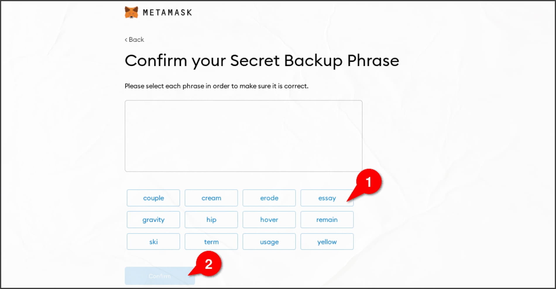 Cài đặt Metamask. Bước 6. Tiếp theo, nhấp vào các từ trong cụm từ gốc của anh ấy theo đúng thứ tự để chứng minh rằng chúng tôi đã viết chúng đúng. Sau đó nhấn Xác nhận:
