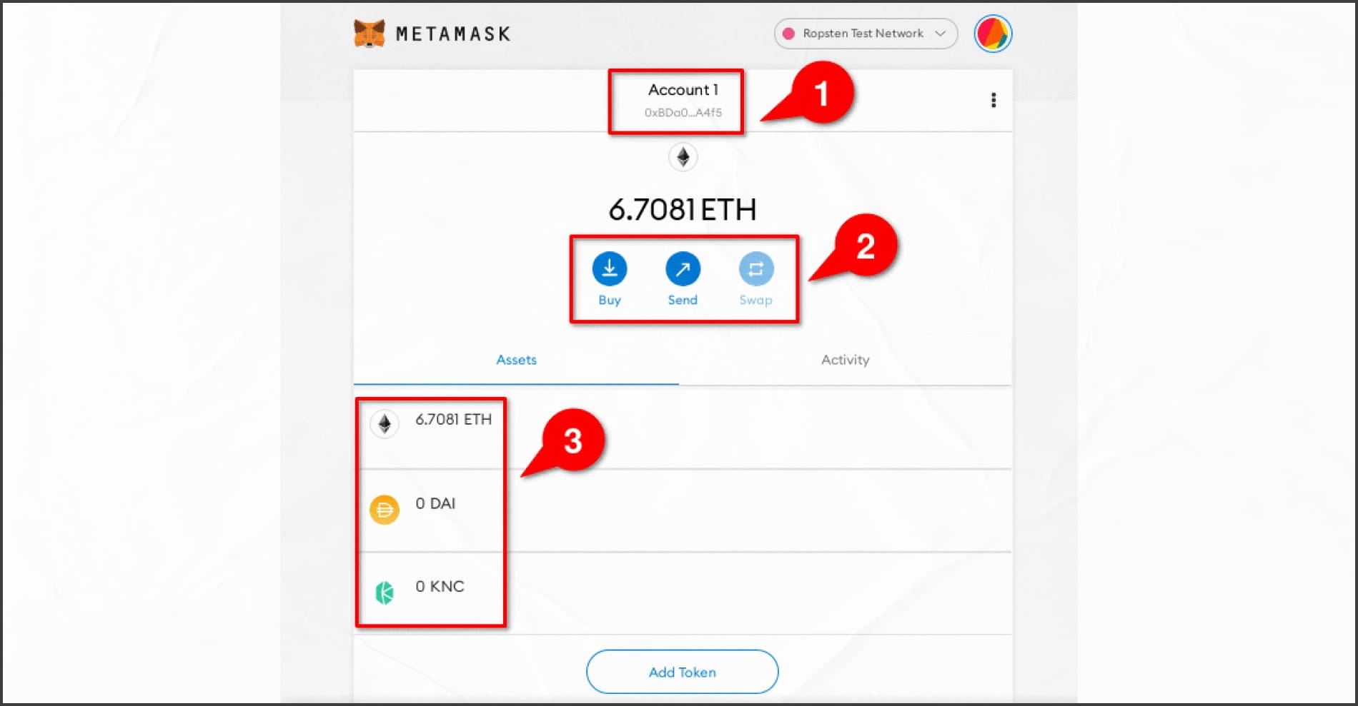 Bạn có thể thấy số dư ở cuối ví (3) sau khi tiền của bạn đã được ghi có. ETH sẽ được hiển thị theo mặc định. Nếu mã thông báo ERC-20 tùy chỉnh không được hiển thị, hãy nhấp vào Thêm mã thông báo: