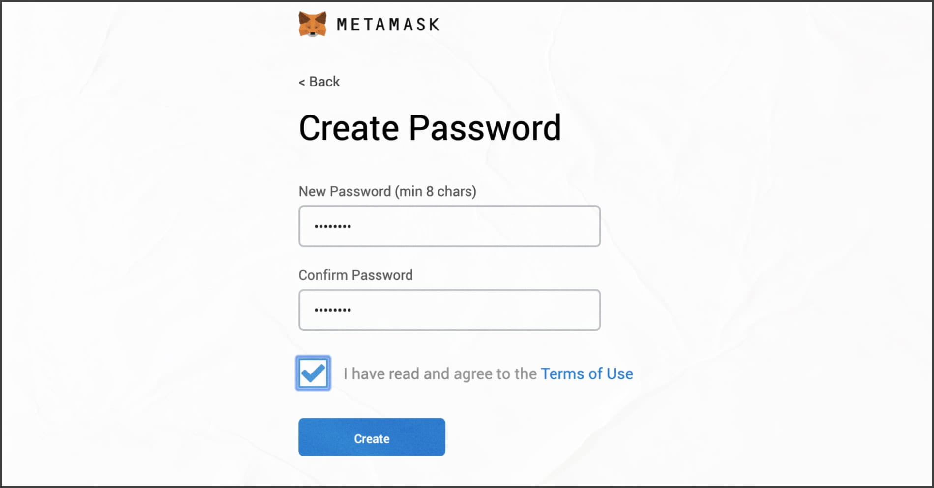 Cài đặt Metamask. Bước 4. Bây giờ hãy tạo mật khẩu cho ví. Bạn phải tạo mật khẩu an toàn có ít nhất 8 ký tự. Sau đó, nhấp vào Tạo: