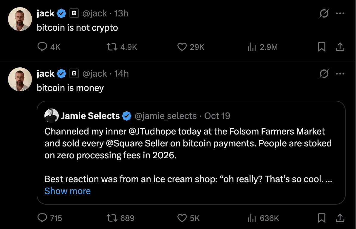据 ChainCatcher 报道,Twitter 联合创始人 Jack Dorsey 发文称,比特币不是加密货币,比特币就是货币。