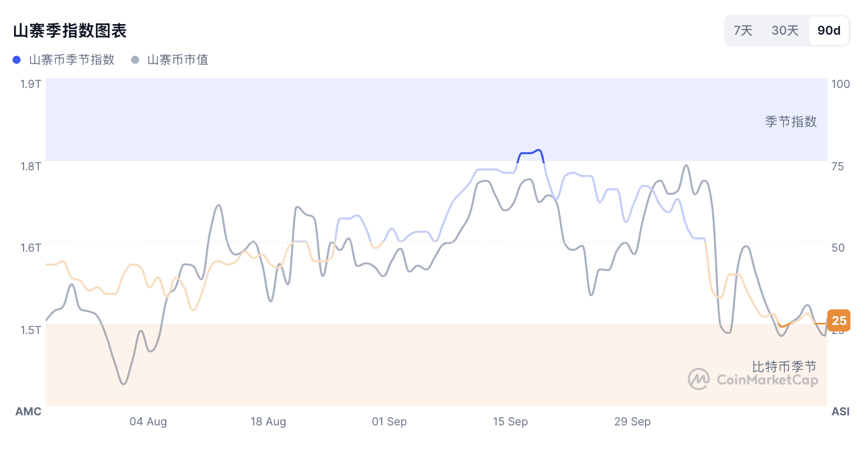 据 CoinMarketCap 数据显示,CMC 山寨币季节指数维持在 25。该指数显示在过去 90 天内,市值前 100 加密货币中约 25 个项目涨幅超越比特币。
