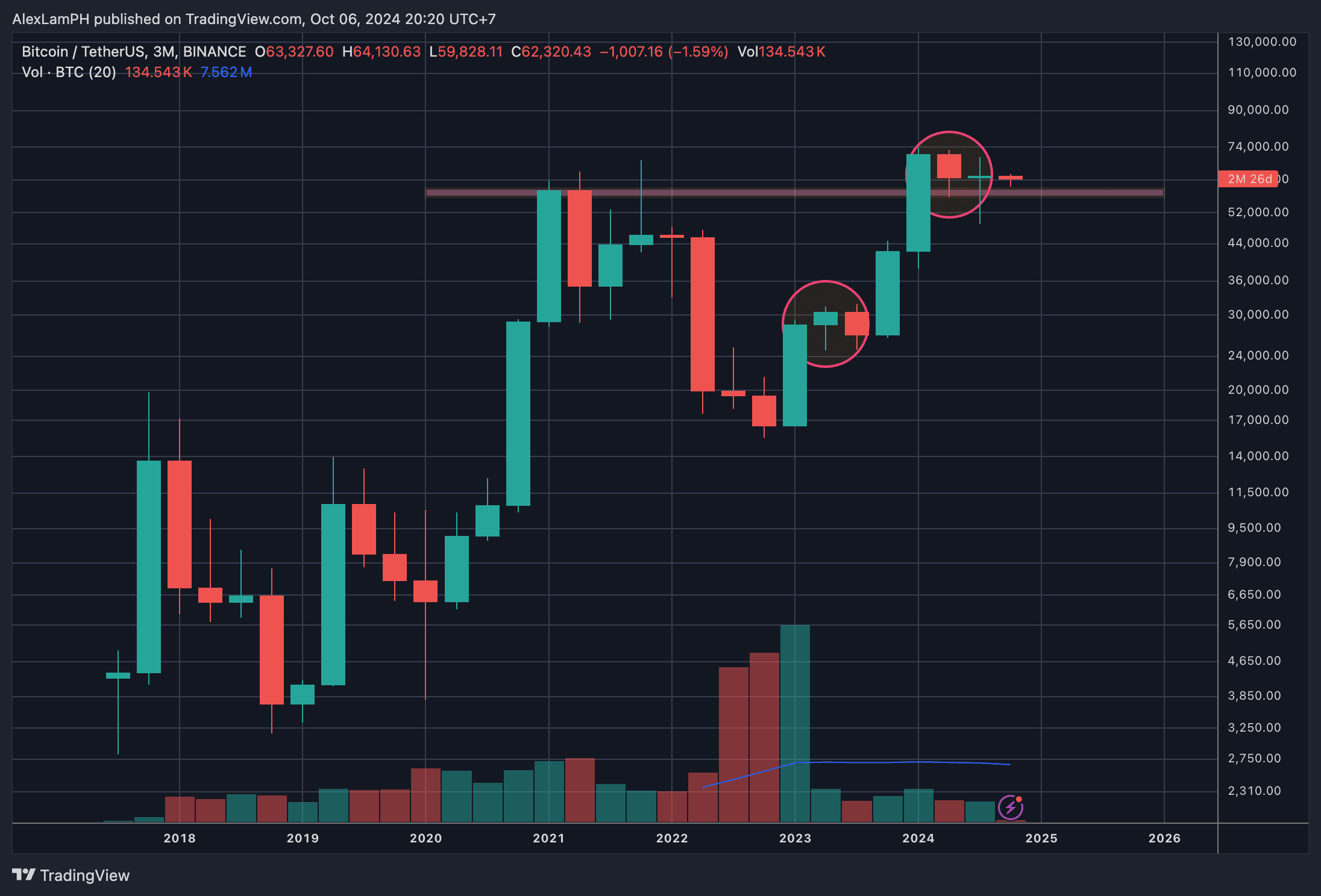 考虑到$BTC 的季度蜡烛图,我们观察到比特币仍处于长期宏观上升趋势中。我认为这种增长过程是“健康的”,因为每个增长期之后,都会有一个重新积累和市场再平衡的阶段。如果价格上涨速度不快,它就可以继续上涨,而且上涨速度会更可持续。