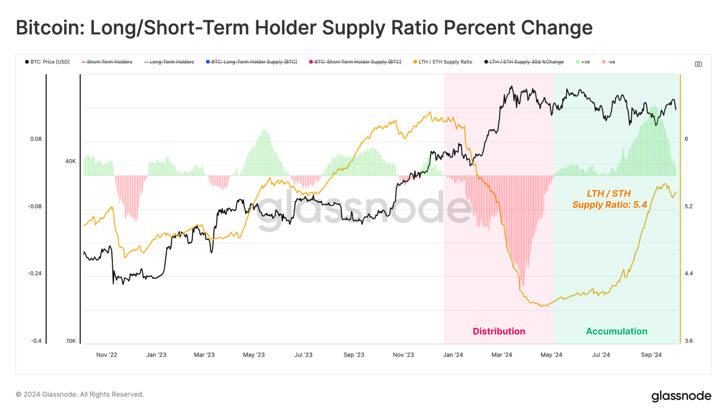 为了进一步支持比特币的宏观增长论点,自 2024 年 3 月比特币创下历史新高以来,长期投资者持有的比特币供应量数据再次上升。这表明,在比特币创下历史新高之后,正在进入重新积累阶段;自 2024 年初以来,获利的供应量已被充分吸收并重新分配。这一过程使比特币的价格保持稳定,大部分徘徊在 60,000 美元以上,这是比特币历史上在最高价格水平上活动时间最长的一段时间。