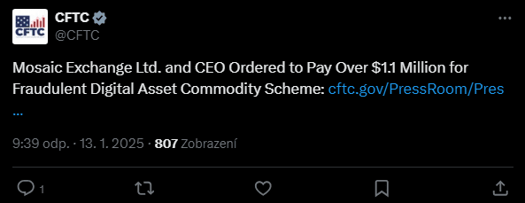 美国佛罗里达州南区地方法院于 2023 年 9 月审结了美国商品期货交易委员会 (CFTC) 提起的一起案件。法院裁定 Mosaic Exchange 及其首席执行官违反了《商品交易法》。该欺诈行为于 2019 年 2 月至 2021 年 6 月期间实施,目标是来自不同国家的投资者。