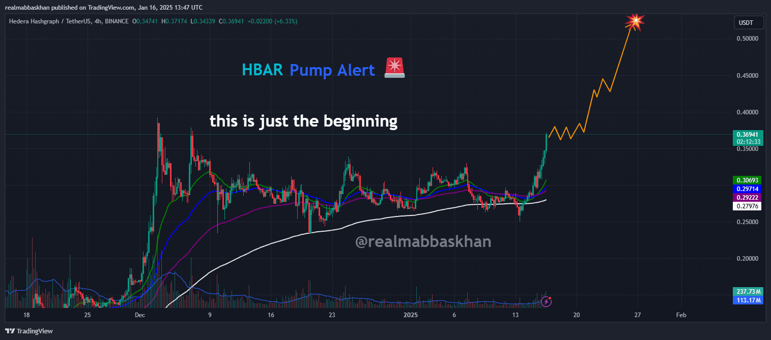 💥突破模式表明 HBAR 的目标价格可能为 0.51 美元,较当前价格水平上涨 40%。