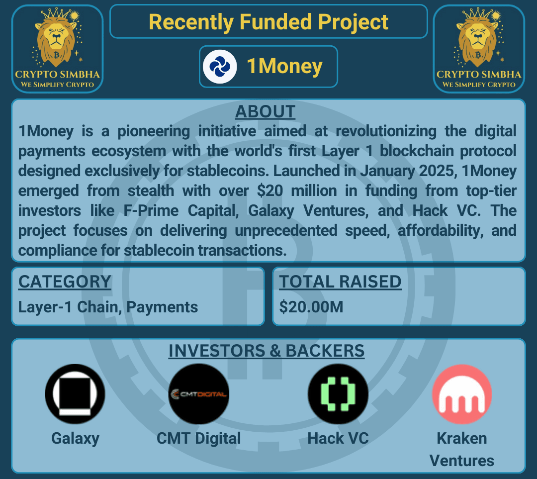🔹简介:1Money 是一项开创性的计划,旨在通过世界上第一个专为稳定币设计的第 1 层区块链协议彻底改变数字支付生态系统。1Money 于 2025 年 1 月推出,从 F-Prime Capital、Galaxy Ventures 和 Hack VC 等顶级投资者那里获得了超过 2000 万美元的资金。该项目专注于为稳定币交易提供前所未有的速度、可负担性和合规性。主要功能包括即时交易确认、低固定费用、多币种支持、嵌入式合规机制和每秒能够处理超过 250,000 笔交易的大规模可扩展性。1Money 由 Brian Shroder 共同创立,旨在弥合 Web3 技术与日常金融交易之间的差距,使稳定币成为现代化全球金融体系的基石。🚀🌐