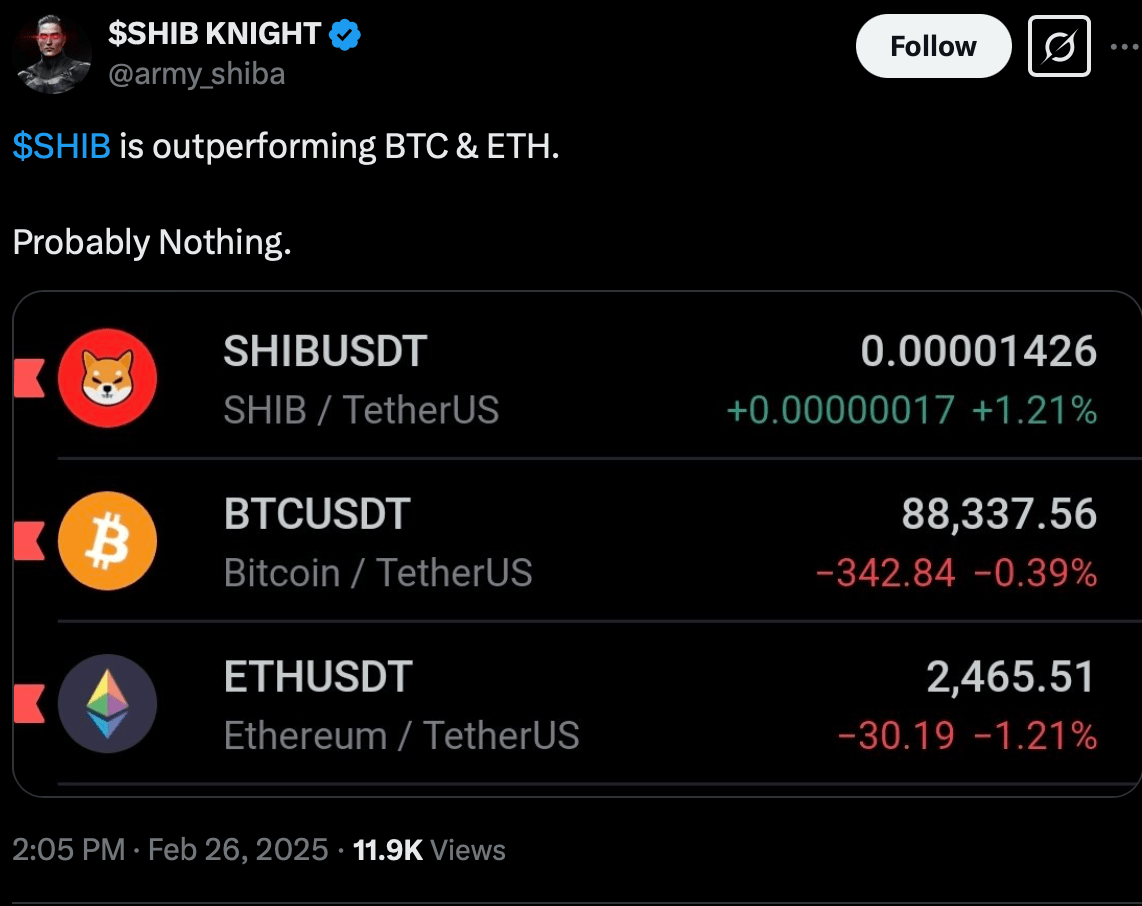 有趣的是,SHIB的表现超过了比特币和以太坊,这两者因唐纳德·特朗普引入的新关税而经历了显著的下跌。与此同时,基于以太坊的模因代币保持了韧性。