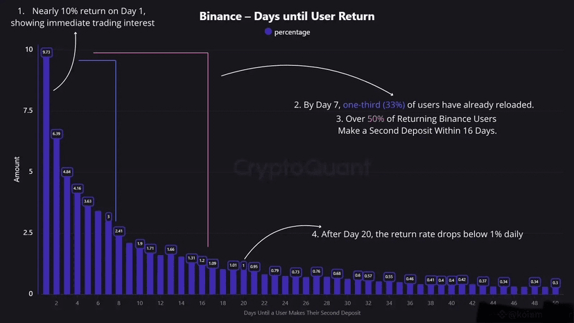 此外,三分之一的回归客户在第七天时会补充他们的账户。这一模式进一步强调了Binance对重复交易者的吸引力。就像一个热闹的市场,交易者们来来往往,不断寻找下一个巨大机会。
