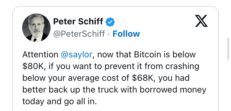 与此同时,长期批评比特币的彼得·希夫 (Peter Schiff) 对可能的盈亏平衡做出了反应。在周日的一条推文中,他在比特币崩盘后嘲讽了 Strategy,并要求塞勒再次借钱购买更多比特币,如果他想防止比特币跌破平均价格的话。