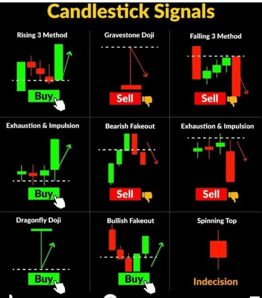 蜡烛图形态是技术分析中用于预测市场走势的强大工具,基于历史价格行为。它们为交易者提供了有关潜在看涨(向上)或看跌(向下)趋势的宝贵见解。您提供的图表突出了九个关键蜡烛图信号,可以指导买入、卖出或持有决策。以下是每个信号的解释:
