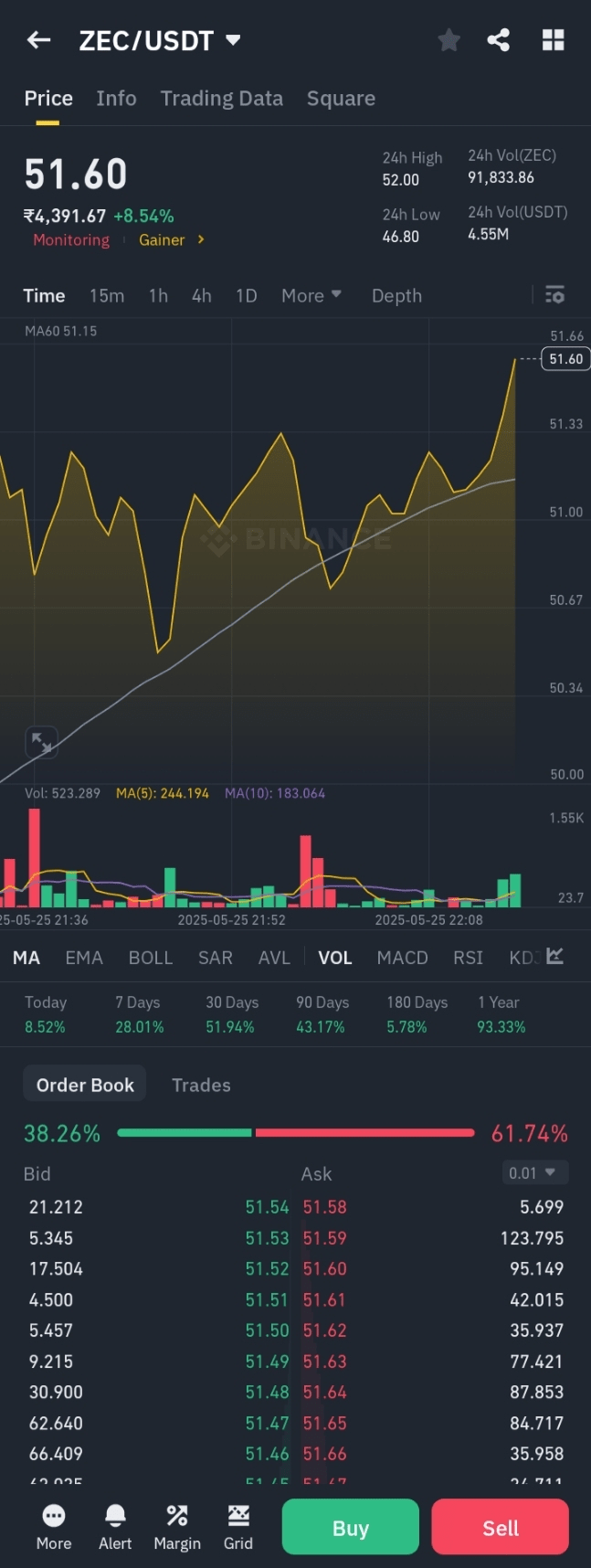 截至2025年5月26日,Zcash(ZEC)的交易价格为$51.45 USDT,盘中最高价为$51.45,最低价为$47.19。