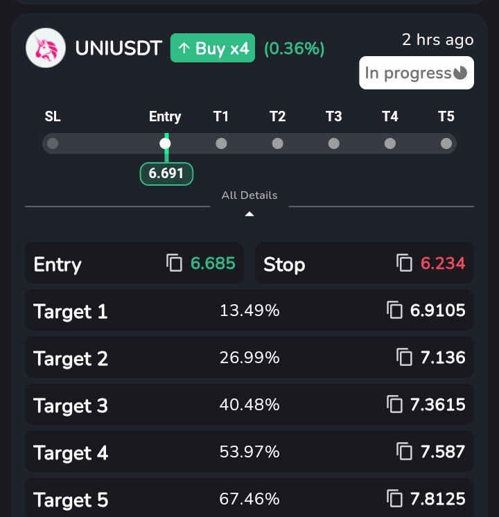 朋友们,一个新的UNIUSDT信号来了,看起来非常看涨!📈 入场定在6.685,价格目前保持稳定。信号是在两个小时前发出的,意味着仍然有时间进行入场。
