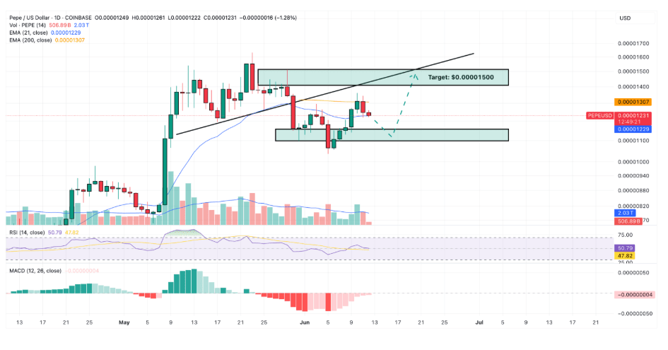 佩佩(PEPE)在5月底突破其趋势线支撑时,果断跌破$0.00001300水平,并伴随强劲的成交量。