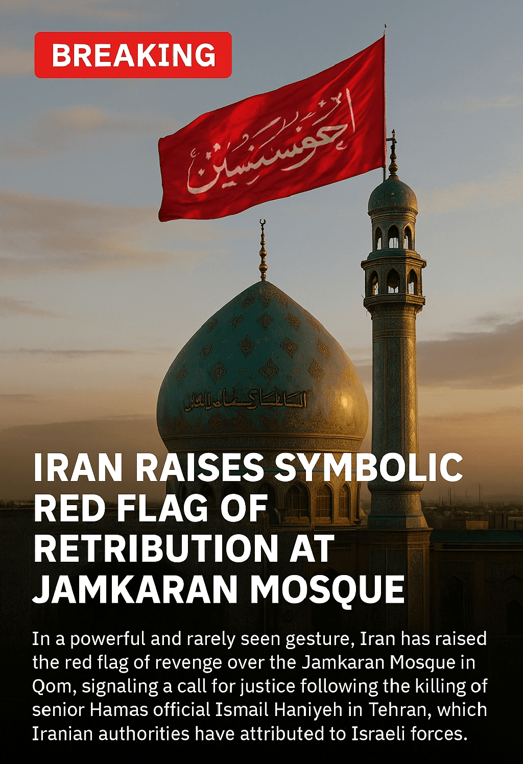 在一个戏剧性和象征性的举动中,伊朗在库姆的贾姆卡兰清真寺上升起了报复的红旗——这是一个罕见的什叶派传统,象征着对国家悲剧后正义的要求。