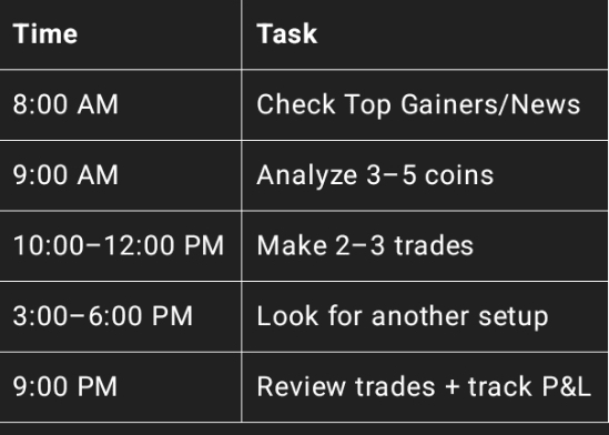 时间任务8:00 AM检查热门涨幅/新闻9:00 AM分析3–5个币种10:00–12:00 PM进行2–3笔交易3:00–6:00 PM寻找另一个机会9:00 PM复盘交易 + 跟踪盈亏