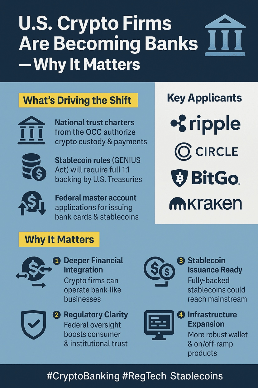 瑞波(Ripple)、Circle、BitGo 和 Kraken 正在争相获得国家信托银行特许经营权,标志着历史性的转变:加密公司不再拒绝传统金融——他们正在接受它。这一转变的驱动力是什么——以及它对你意味着什么。