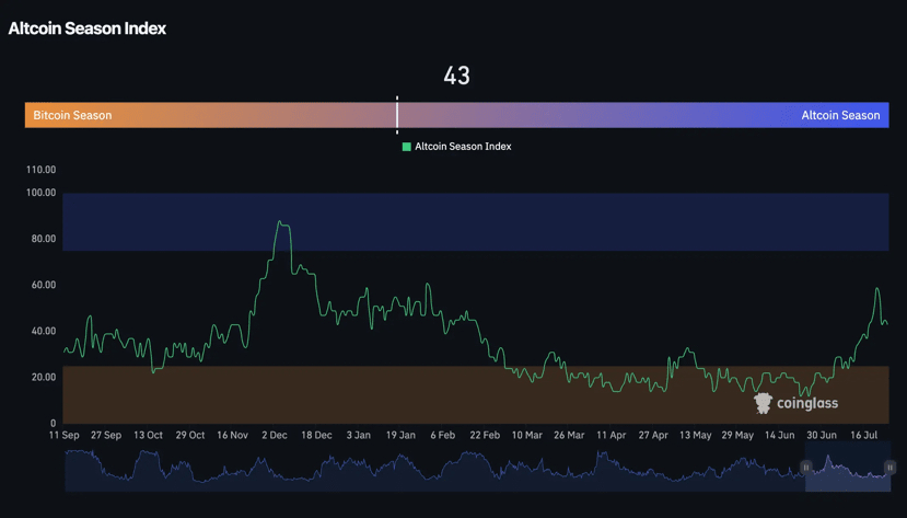 此次回调可能是由于山寨币市场的过度杠杆,未平仓合约达到了历史风险水平。尽管下跌,分析师表示山寨币季节仍可能继续——但前提是比特币主导率保持在其200日移动平均线以下,这是一个历史上曾预示着长期山寨币上涨的关键技术信号。