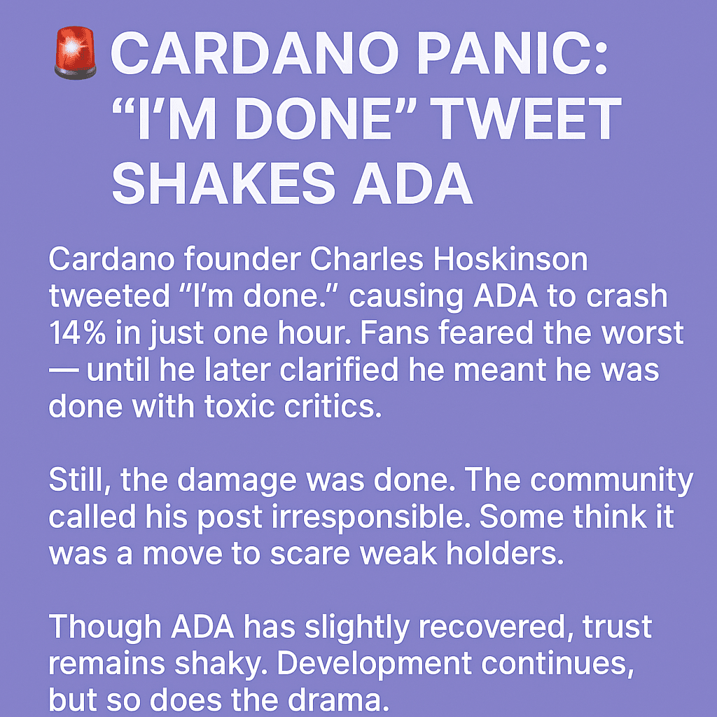 Cardano 创始人查尔斯·霍斯金森(Charles Hoskinson)在推特上发文「我已经厌倦了」,导致 ADA 在短短一小时内暴跌 14%。粉丝们担心最坏的情况——直到他后来澄清他是指对有毒的评论者感到厌倦。