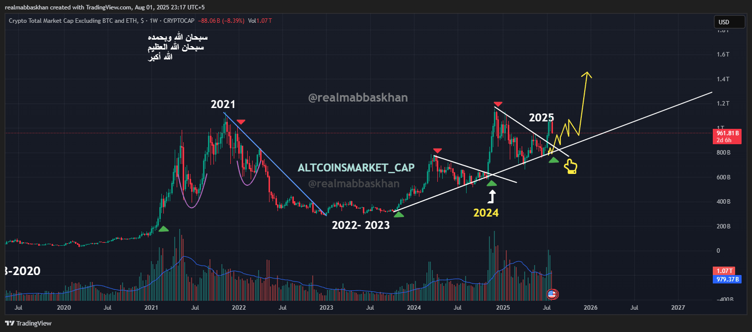 但相信我,这个形态太干净了 🔥但2024年扭转了局面!Altcoin市场市值突破了那个下跌楔形(白线),然后从下方测试趋势线——然后砰💥支撑像冠军一样保持住了(见黄色圆圈 👇)。