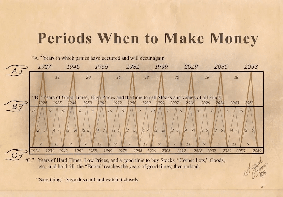 机制:基于他对农业商品价格中反复出现的周期的观察,本纳创建了一个预测图,延伸到2059年。