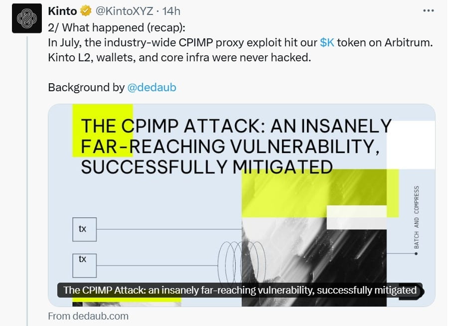 在 7 月初,代币系统的一个漏洞允许攻击者铸造假代币并从 Morpho 借贷池中抽取价值。大约 577 ETH,约合 160 万美元——在事件中被盗。该漏洞源于一个代理级别的弱点,影响了多个使用类似合同模式的项目。此次冲击对 Kinto 的代币及其财务造成了严重打击。