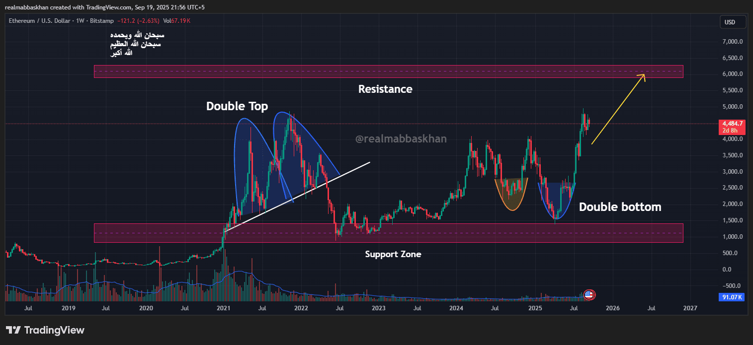 在2022年的熊市中,ETH触及了$925的支撑区并形成了双顶,随后崩溃。快进到2025年的牛市……ETH展现出完全相反的镜像模式 – 一个双底✅