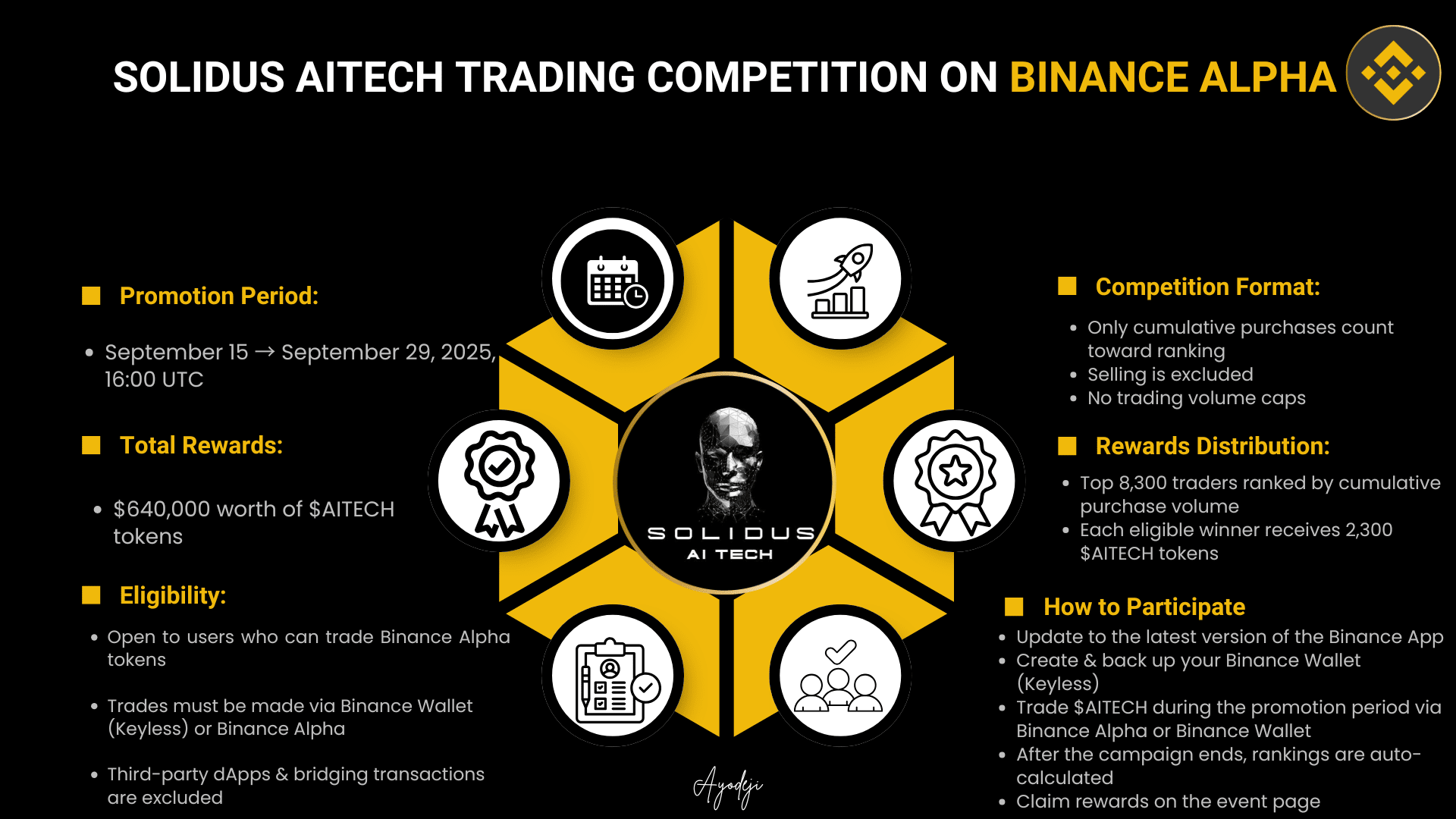 今天我将把我们的重点转向 Solidus$AITECH 交易比赛,定于#Binance Alpha 从 9 月 15 日 16:00 UTC 开始到 9 月 29 日 16:00 UTC。