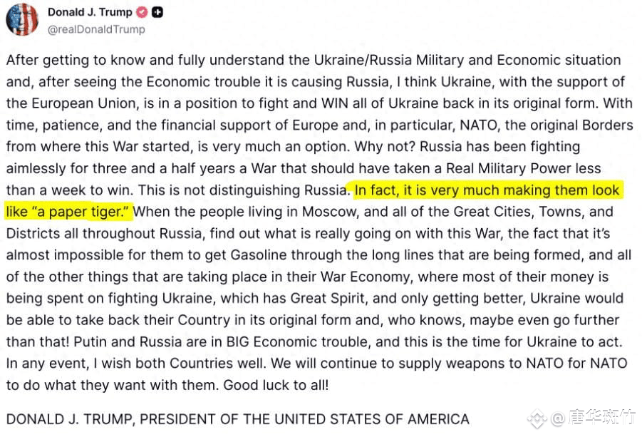 特朗普态度一夜间大反转,支持乌克兰夺回全部国土。美国总统口中,俄罗斯就是个“纸老虎”。