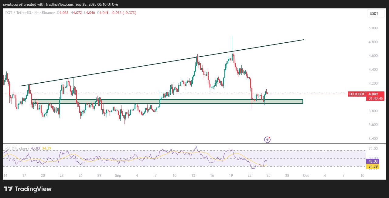 DOT/USDT 图表显示价格未能维持高位,并接近关键支撑位。相对强弱指数(RSI)较弱,反映出卖压。如果支撑位破裂,可能会进一步下跌。整体情绪似乎看跌,表明卖方可能控制着市场。