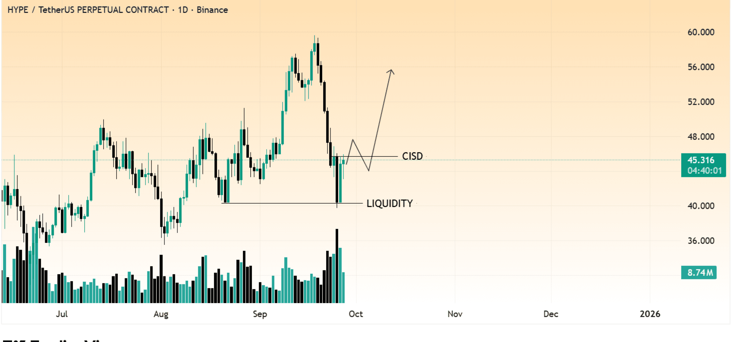 $HYPE 现在有大流动性扫荡,我在等待CISD突破。如果价格在日线时间框架内突破卖出高潮并伴随动能蜡烛,我们将在HYPE上开多单或买入,并设定所有时间高的目标。