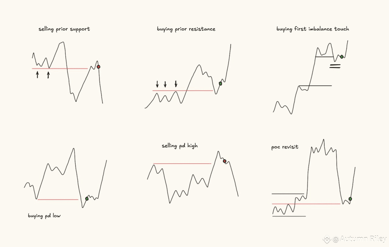 The chart shows six common setups that traders look for when entering the market. Each one is based on simple principles: support, resistance, liquidity, and imbalances.